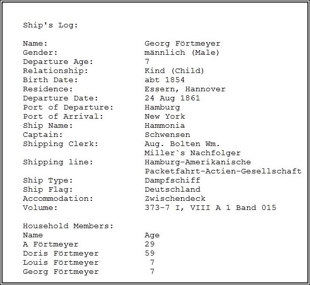 The passenger list showing the arrival of Adolph, Doris, Louis and Georg Förtmeier shows that they came on the ship Hammonia. The captain was Schwensen. It was a German ship, dampfschiff class, and their accomodations were Zweite Kajute...second cabin. They departed Hamburg on 24 Aug 1861 on the ship Hammonia and arrived in New York...not sure of date. Adolph's age is reported as 29, Doris is 59, Louis and Georg are 7. Adolph was the fourth child of Doris Georg Förtmeier, Louis is Louis Charles Förtmeier, Doris's youngest child and my great grandfather, and George is the bastard son of the oldest daughter, Dorothee Luise Förtmeier, B: 02 Jun 1826 in Essern, Nienburg, Lower Saxony, Germany.