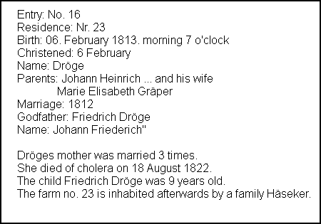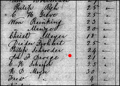 So, who was F. Droege? Was he someone from "back home" that Georg knew? Thanks to my friend Manfred we now know a lot more about Johann Friederich Dröge. As Manfred had said, the name Dröge is more common around Bohnhorst, and he was correct. Johann Friederich Dröge was born on February 6, 1813 in Bohnhorst. His parents were Johann Heinrich Dröge (1788-1816) born in Hauskämpen and Marie Elisabeth Gräper (1781-1822) born in Sapelloh. Both parents died in Bohnhorst. The family owned farm No.23 in Bohnhorst. Johann was orphaned at age 9 and for all we know, may have been housed and fed by the Förtmeier family. Maybe that is why it appears that Johann Dröge came back from Cincinnati to Germany to escort Georg to Cincinnati and board him in his home.