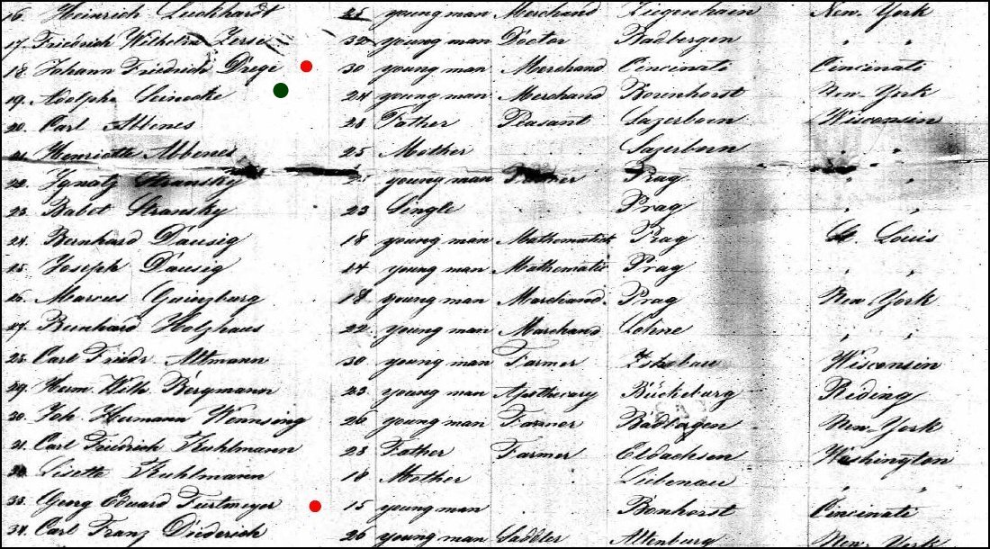 Listings on the June 27, 1846 voyage on the ship Johan George bringing Georg Förtmeier to Cincinnati and bringing Johann Dröge back to Cincinnati. Also notice, when you click on the above item, the green dot, which marks Adolph Seinecke, a relative of Anna Seinecke, my twice great grandmother.