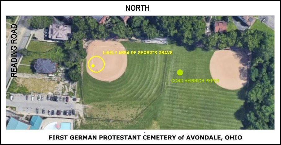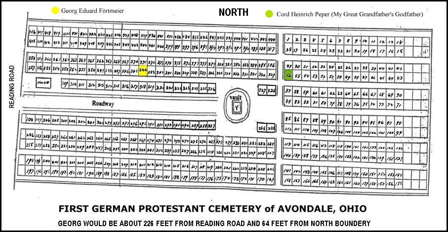 BREAKTHROUGH:  As of today, February 24, 2019, we now know where Georg was buried. According to Jessie Hicks, Senior Library Services Assistant, Genealogy & Local History Department, Public Library of Cincinnati & Hamilton County, "I found a burial record for Georg Eduard Foertmeier (Fortmeier, etc) in the Hamilton County, Ohio Burial Records edited by Jeffrey Herbert. In volume 13, which covers the First German Protestant Cemetery of Avondale—also called the Cholera Cemetery—located at 3632 Reading Road, there is a listing on page 13 for Georg Edward Fortmeier (this is how it is spelled in the record) buried 10 June 1851 in Lot 344, age 20."