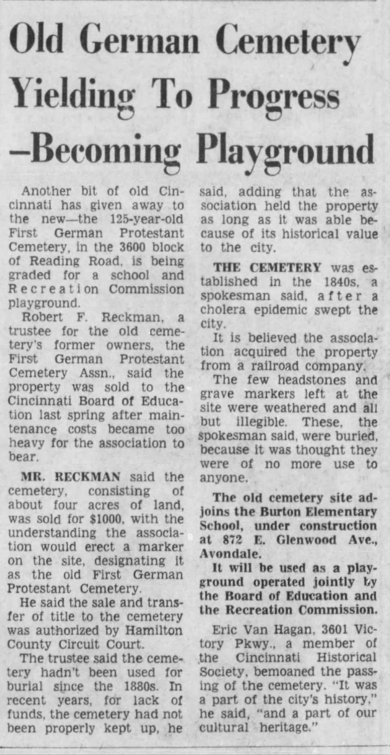 The land for this four-acre burial ground was purchased in 1843 by John F. Kestner, John F. Clauhide, and Fred VonSeggern as trustees for the First German Protestant Cemetery Society of Avondale, which was comprised of 100 stockholders each having as his share a lot 16x16 feet for the use of his family. There were in total 444 lots and a common ground for individual burials. During the cholera epidemic years which began in 1849, the extreme number of cholera victims buried here gave the cemetery a dire reputation, and was referred to as the Cholera Cemetery in Cincinnati. Over the large iron gate entrance at 3632 Reading Road hung a key to the gate. Popular legend in the nineteenth century held that anyone who touched the key would die within a year, also fear about disturbing the ground further where the cholera victims were buried led to this cemetery being closed in 1878 and placed under the care of a trusteeship of seven men. The record books for the cemetery were kept entirely in German and after passing through many stewardships are in the rare book department of the Public Library of Cincinnati and Hamilton County. No grave markers exist at this time, and the entire site has been leveled as the parking lot and ball field of the Hirsch Community Center in Avondale. Details provided by Todd Whitesides (#47553735).