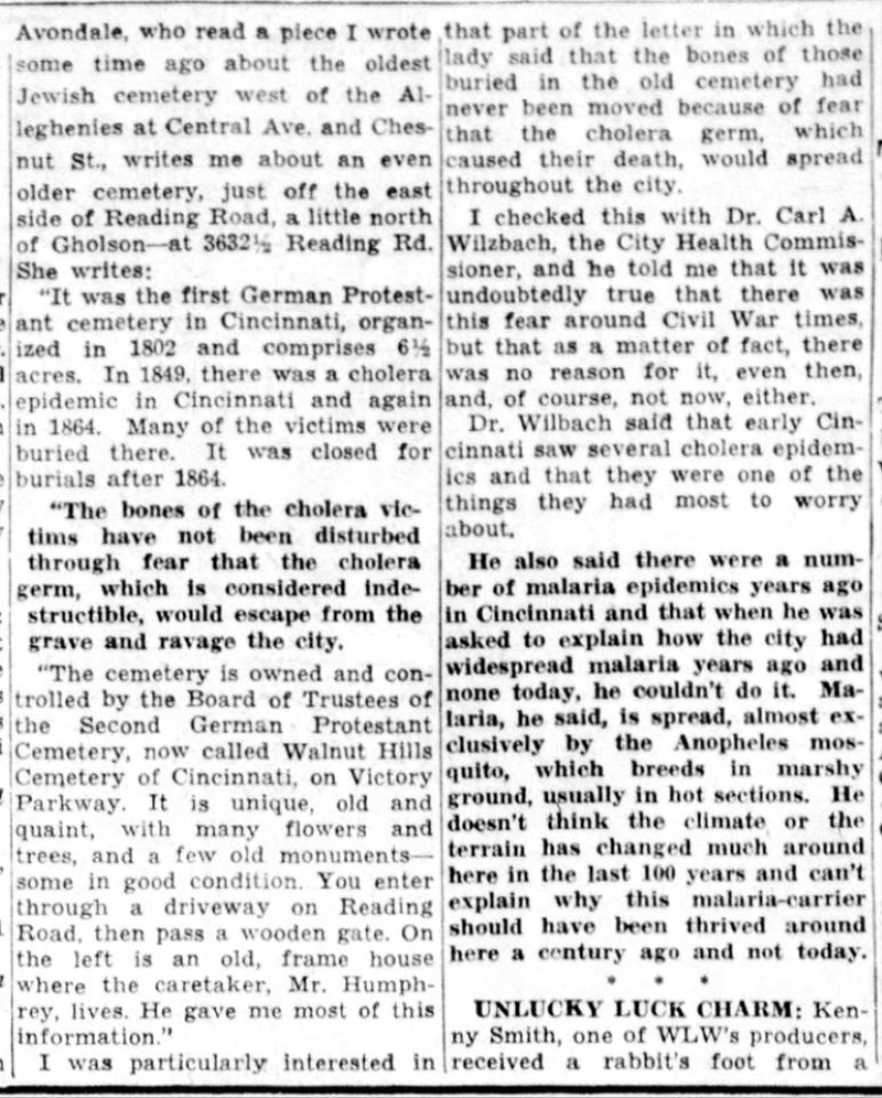 According to Professor Michael Washington, "The first German Protestant Cemetery was organized in 1802 and located at 3632 Reading Road on six-and-a-half acres. Many victims of the cholera epidemics, which occured seven times between 1832 and 1880, and killed about 7,500 people, were buried there.