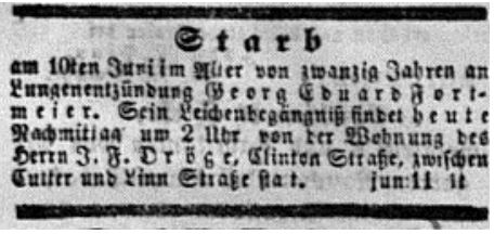 For a long time, we here in the present had no idea what happened to Georg after he got here, or even if he ever did get here. Up until April, 2018 all we had discovered was that he appeared in two Cincinnati Business Directories, 1850-1851 and 1851 to 1852. In 1852 he was listed as boarding with F. Droege and he was a clerk at H.B. Habenback. Strangely enough, on the next line it lists H.G. Fortmeyer, also a clerk (does not say where) and boarding with F. Droge. In the 1853 directory all three names (Geo. E., H.G., and H.B. Habenback) all disappear, so far, with the exception of Georg, forever. In April, 2018 I discovered a death notice for Georg Eduard Fortmeier who had died on June 10, 1851. I had previously come to believe that Georg may have died of cholera in the 1849-1851 epidemic, which took over 5,900 lives in Cincinnati. The death notice, which had appeared in the June 11, 1851 Cincinnati Volksblatt, was written in old German. So, I sent it to my friend Manfred Raker in Germany for translation. Here is what it said: