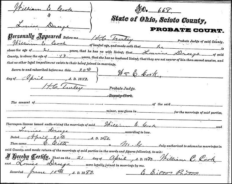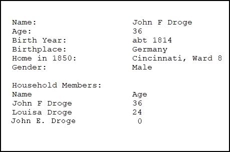 Below are links to census data gathered for the Dröge family. Johann and Lucy were married in 1847 and in 1851 they had a son, born while still in Cincinnati, they named John E. Droege. Unfortunately, young John died in Portsmouth, Ohio on March 8, 1867, a victim of scarlet fever. The boy was only six years old. Also, in 1857, a girl was born to Johann and Louisa and they named her Louisa. Louisa married in 1880 William Cook. Louisa passed in 1927, but William lived on to 1956, passing away at ninety-eight years of age.