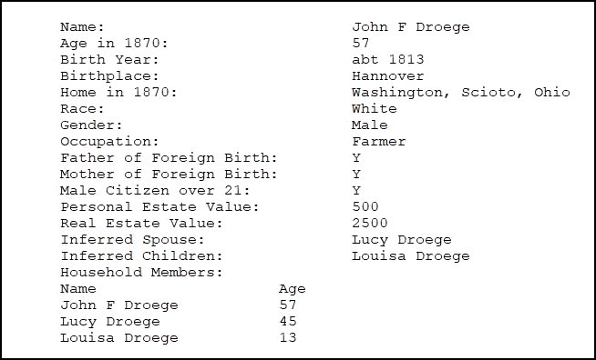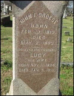 I could find nothing between 1870 and 1893, when Johann dies on May 2, 1893. He was laid to rest in the Greenlawn Cemetery, 55 Mary Ann Street, Portsmouth, Ohio. On January 5, 1910 his wife Lucy joins him there. As to Caroline and Louise Droege, the children, I have found no more on Caroline, but I did find Louise, resting in peace also in the Greenlawn Cemetery, having passed away herself in 1927. Lying with her is her husband William.