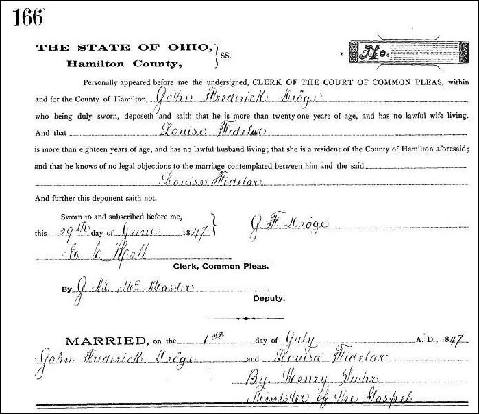 Next, we find that in the very next year, at the age of 34, Johann Dröge (Droege) marries Louise Fidelar on July the first. Of course, as stated before, Georg dies of pneumonia in June of 1851. After that date, I have not found Johann Droege again until the 1860 Federal Census when we find him living in Portsmouth, Ohio, age 57 with his wife Louisa, age 35, also born in Hannover, a daughter Louisa, age 3, born in Ohio. Now, also in the household is a 10-year-old girl named Caroline Droege listed as having been born in Hannover. That would have put her birth in about 1850, three years after the wedding and the year before Georg’s death. Speculation: If he had been raised by the Förtmeiers, in 1850 both his surrogate parents would still have been alive. Perhaps this was a trip back home with the new wife and Georg to visit with their parents. Perhaps Caroline was born there and then.